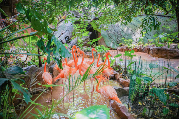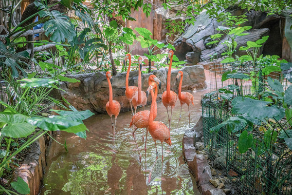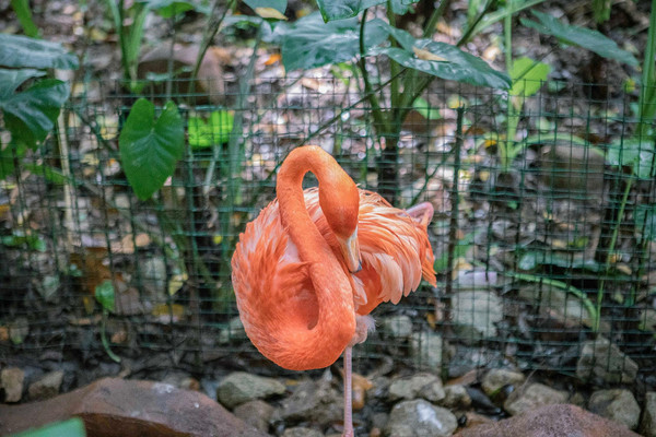 火烈鸟隐藏在一片绿植中,艳丽的羽毛在一片绿色中越发美丽。恰逢中午,它们弯曲着优雅的S型长脖子,单脚撑地静静午休,美丽而优雅,让人不忍打扰。火红艳丽的火烈鸟,似乎在祝大家新的2021年红红火火。