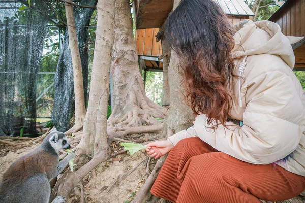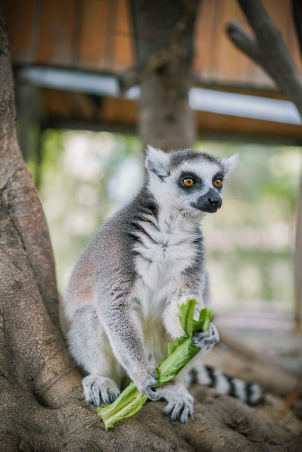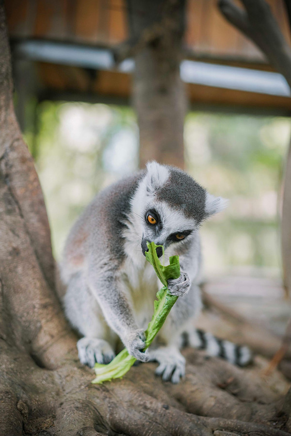 到了环尾狐猴的栖息地方,我们就可以看到这些精灵可爱的环尾狐猴,大大的眼睛,尖尖的耳朵,长长的尾巴,尾巴上有黑白相间的圆环,长得非常精灵。没想到他们也是油麦菜爱好者之一,只要给它一片菜叶子,它便双手抱着菜叶子像个小兔子一样啃食,小嘴吧唧吧唧地动,太可爱了吧!