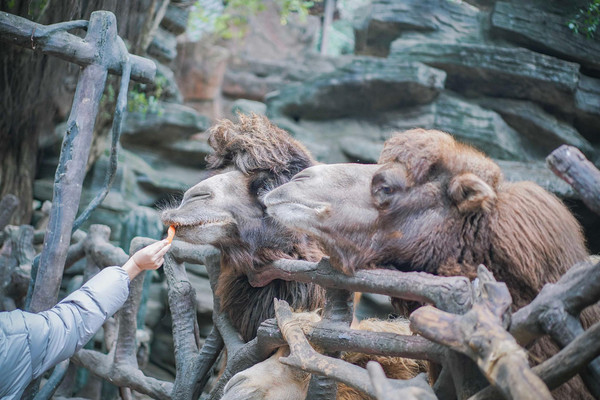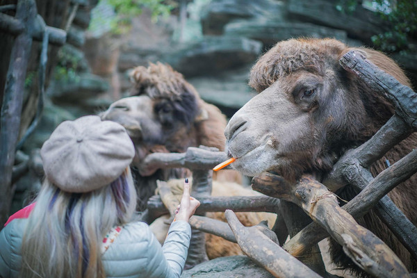 长鹿致力打造一个人与动物和谐相处的动物园,在这里我们可以近距离接触、投喂动物,而不是只能隔着栏杆围观。这不,在进园处就有骆驼投喂点,很多家长带着小朋友来和动物亲密接触,投喂就是最有效的方式。