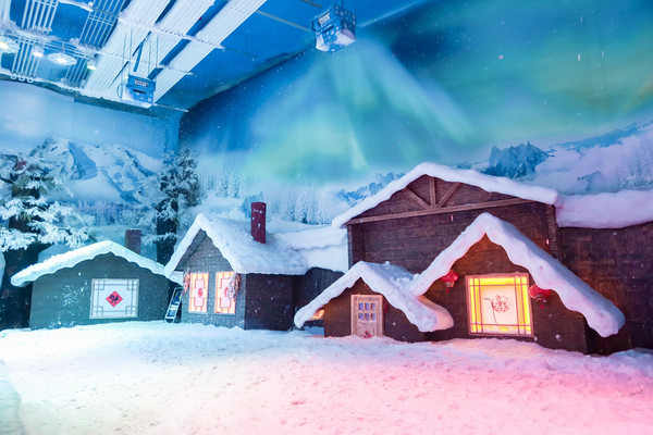 我最喜欢的是北极村雪乡主题,这里真实还原了北极村的雪乡美景:低矮的房子上堆满了雪,窗内透出的暖黄色灯光和窗外摇曳的红灯笼组成了一幅雪乡美景,更重要的是,天空中还有飘飘扬扬的雪花,实在是让人宛如身处雪乡之中,完全不需要亲临漠河,就能看到这美丽的雪乡风情。