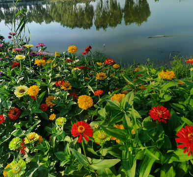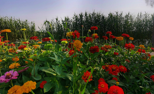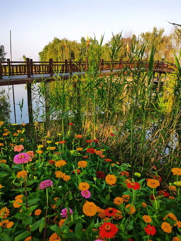 木桥下百日菊花开正盛,五彩斑斓,十分绚丽