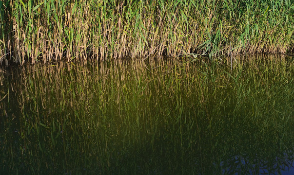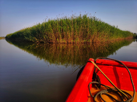 仲夏的芦苇已经长成密密芦荡,仿佛一座座绿墙砌在清澈的湖水中,一眼望不到头。