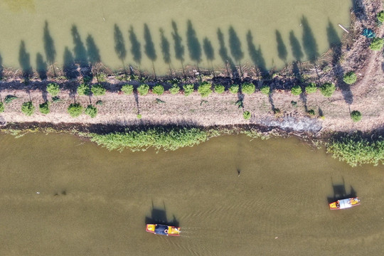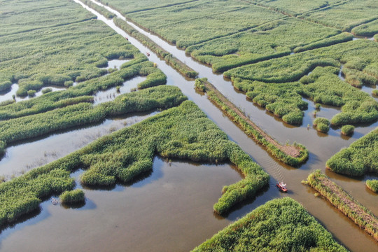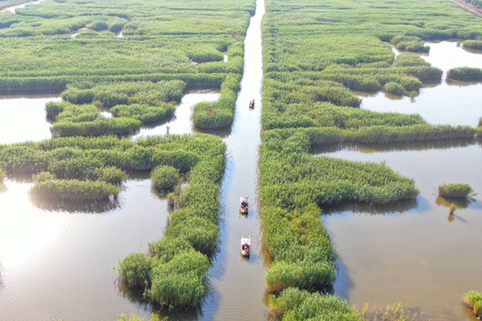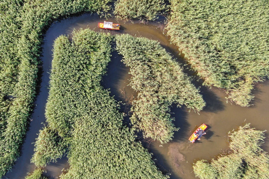 密密匝匝的芦苇将湖水分割成纵横曲折的水巷,犹如一座“芦苇迷宫”。