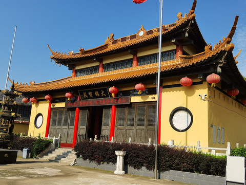 穿过一道长长的廊桥,才能到达在江心小洲上的镇国寺。镇国寺始建于唐代僖宗年间(公元874年),寺门前立着一尊手持净瓶的观世音菩萨金身塑像,寺内有天王殿、大雄宝殿、五百罗汉堂等殿宇。
