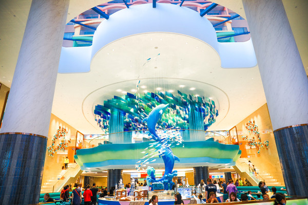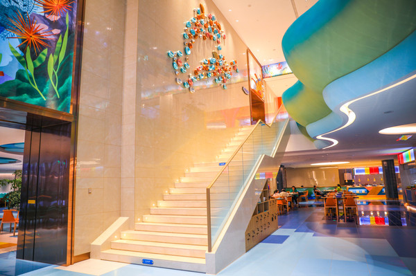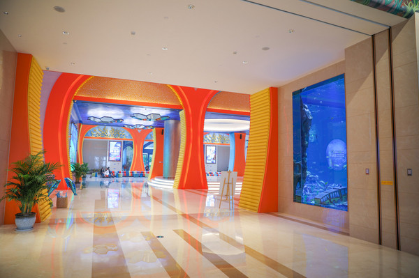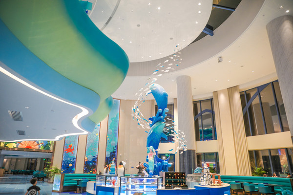海豚湾 酒店以五彩斑斓梦话童话世界为主题,酒店随处可见充满童趣的海洋元素,大堂的大型水族馆非常值得打卡,小朋友一定会开心不已,酒店的海洋大世界大家还可以和海豚近距离接触,可以乘坐酒店内的摆渡车到寒武纪化石博物馆了解生命的起源。