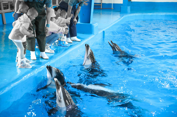 进海豚馆需要穿鞋套,然后消毒。坐船之前也需要将手部认真的消毒,保护海豚。可以坐船喂海豚小鱼吃,不过要注意尽量不要摸海豚,以免咬伤。
