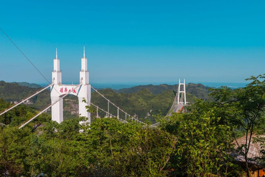 1jQuery17108759738190050919_1625644879027矮寨大桥:是包茂高速(G65)跨越德夯大峡谷的一座特大型桥梁,此桥地处云贵高原和沅麻盆地交界处,地势险要,桥梁建设中当时创下了四个“世界第一”。