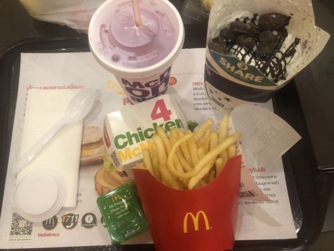 第9天中午也是选了一家据说是网红店,环境很小资,挺适合拍照的,但是菜的口味真的一般,而且和陌生团友一起吃饭,也是有点别扭。晚上,团费中赠送一个网红凤飞飞猪脚饭,结果发现送的比单点的分量少了将近一半,还好计划去尝一下泰国的麦当劳,用自助机器点餐,感觉跟在国内一样方便~