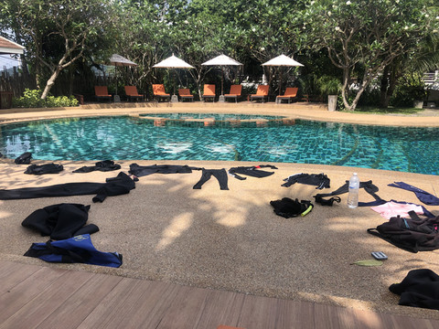 很快上午就迎来了泳池技巧训练,从设备的穿戴开始,背上氧气瓶的一刻,真的觉得自己的力气不够大。进行了几个浮潜的技巧训练,然后是在水面上潜水的各种技巧训练。潜水主要是用嘴巴呼吸,但是我的鼻子有一点不自主的呼吸,好在影响不大。