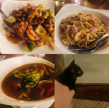 第二天中午为了节约时间,就在Ban’s门口的猪脚饭简单吃了一顿,虽说很多人推荐,但是也太油了吧,直接导致下午训练吐了,所以之后到潜水课程结束,我都没敢吃太油的东西。第二天晚上去了一家西餐厅,菜色一般,但是海风很舒服,而且是躺椅式的座位,还有不怕人的猫在你身边走来走去,极大满足了我小伙伴的撸猫欲望。