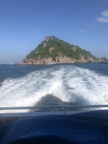坐上大巴,开了一小会就到码头了,上船后没有指定位置,自己找空位坐就行。船一共有三层,最底下一层是在船舱内,空调特别冷,上面两层是在室外,会有点晒。建议晕车晕船的带点药,海边长大的我其实不会晕船,但是它这个船浪大的时候确实比较晃,而且有别人一吐,船舱味比较大,而且太冷了,所以确实坐的不太舒服,但这是上岛的必经交通工具,整个船程印象中两个小时左右,也只能克服一下了。船舱内晃得什么景色也看不了,可以出去透透气,看看真的非常清澈的海水。