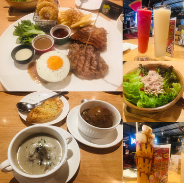 第7天中午是在暹罗古城72府里面用的团餐,号称“兰纳帝王餐”,还有一些自助小吃,可以体验自制青木瓜沙拉,餐厅基本都是接待团队游客的,大概来这个景点玩,就只能在这个餐厅吃饭。晚上去了酒店附近一家网红牛排店,写点评还送了一杯泰式奶茶,不过我很好奇,我写中文那个小哥能看懂吗?