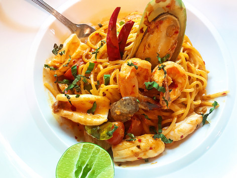千万别以为Chom Cafe和一般的网红店一样,只是适合拍照,其实它家的泰国菜也是可圈可点的。比如我点的这个“冬阴功意面”就是很有创意的,冬阴功的酸辣成功综合海鲜的腥味,意面完全吸入冬阴功和海鲜的鲜美,犹如北京遇上西雅图,有一种似曾相识的感觉。