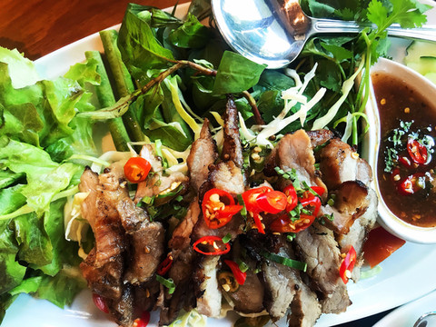 炭烤猪颈肉虽然不是什么特别的菜,但是它家的这款猪颈肉特别鲜嫩,再加上蘸料是泰式那种酸辣口感,吃起来肉香十足。