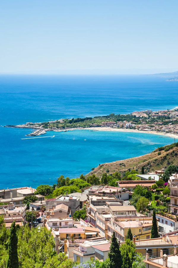 边是广阔、蓝色的伊奥尼亚海的海上风光,另一边是埃特纳火山的壮丽山景。
