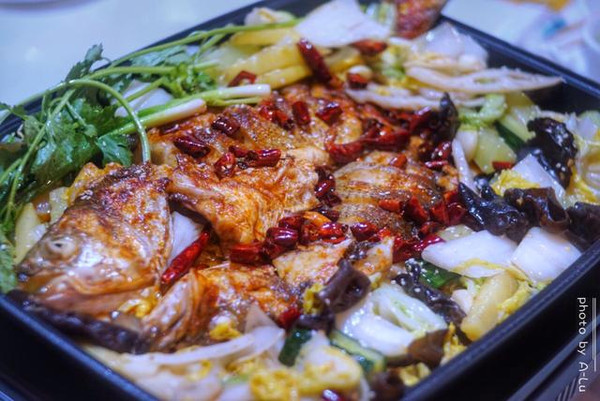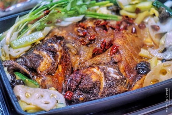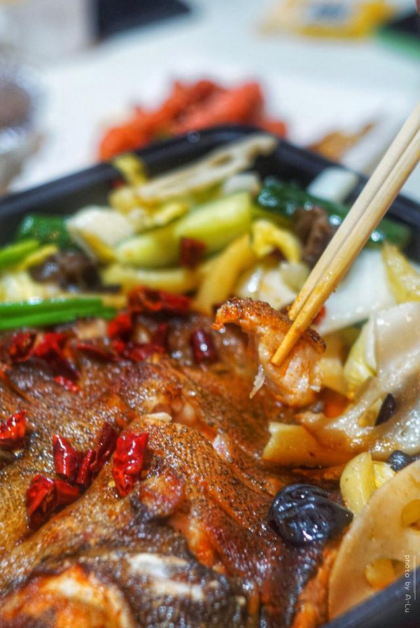 环境古色古香,有着老重庆的复古,配有小包厢,包厢还以重庆的地名命名。透明的玻璃隔着半开放式的厨房,一池活鱼,现捞现杀现烤,由于现杀现烤,需半小时的等待,就可以吃到最新鲜的烤鱼。既然主打烤鱼,那烤鱼必是“五叔”的拿手绝活。炭烤海鲈鱼经典的入门款炭烤海鱼-----海鲈鱼,烤海鲈鱼色泽十分诱人,鲜亮的橙红色让人食欲大增。配有娃娃菜、莴笋、黑木耳、黄瓜、土豆、藕片、洋葱等配菜,配菜比起以往烤鱼看着清爽,干净,随着底部炭火的加热,咕咚咕咚冒着热泡,烤鱼也随之逐渐入味。