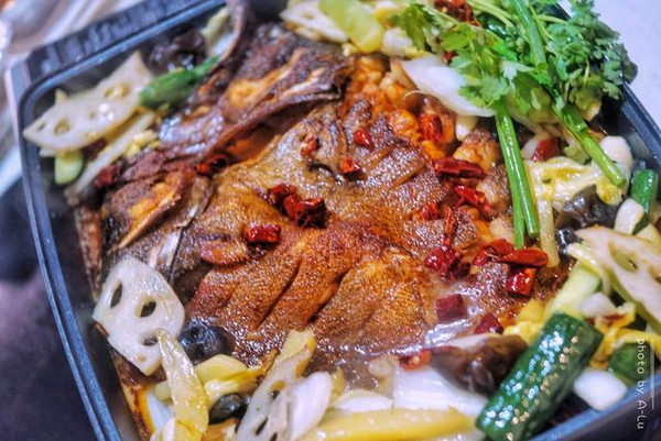 一片烤鲈鱼,慢慢品之,皮微微的焦,鱼肉已入味,鱼肉细嫩,鲜香四溢,这份鲜美让人停不住筷子。配菜多了份爽脆,鲜甜,入味,也是备受喜爱。