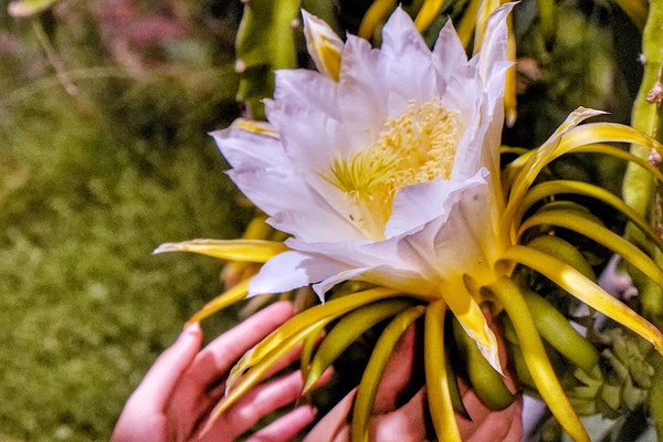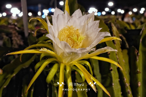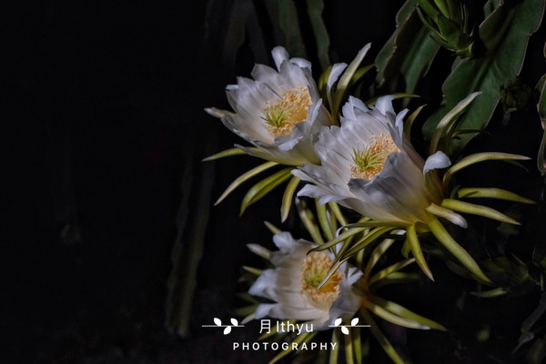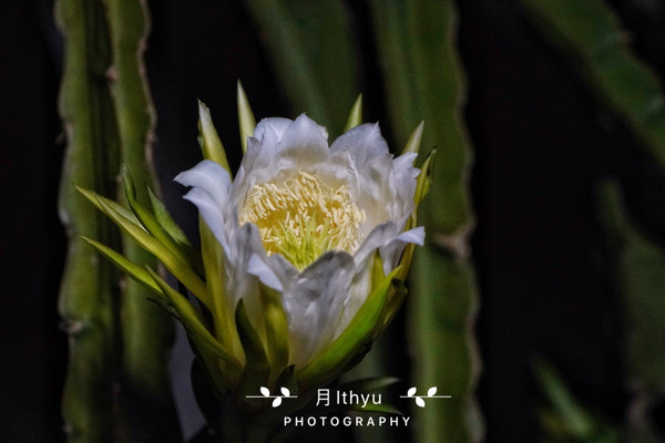 到了夜晚可不要早早睡噢,这时候火龙果花在悄悄地绽放,整片的雪白星点,美得像夜间的精灵。只有拿灯光靠近才能发现这是火龙果花,夜越深越美丽,越到晚间才会开得越大,难怪称为霸王花。第一次见到火龙果开花,大家都兴奋得像个孩子,拿起手机打起光,对着花各种拍照,每看到一朵就是一声惊艳,看似相同的花,绽开的角度却各有不同,每一朵都美的让人窒息。站在百花盛开的火龙果园中,闻着花香,欣赏着星空,这种美景估计也只有在此才可以欣赏。