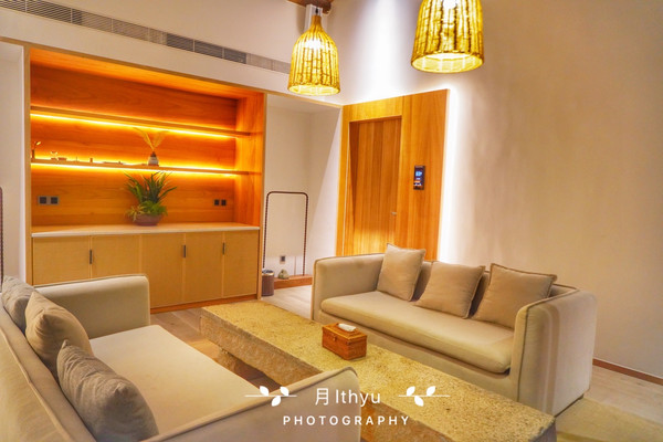 刷卡推开玻璃门,右手边是一张茶桌,中间是天井,再入内就是公共的客厅——休息区,两边则是四个房间,如果同行小伙伴多,可以住在一起,泡泡茶,聊聊天也别有一番惬意,最有特色的莫属坐在室内就可以透过玻璃墙欣赏着天空的变化。