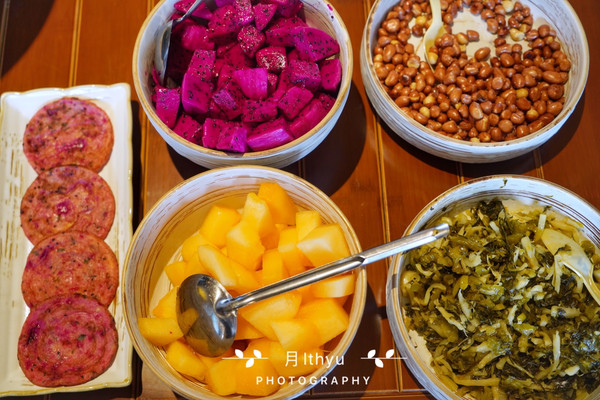 独特的火龙果馒头,造型和普通馒头看似没差别,其实用的是红色的火龙果,会有着淡淡的粉色,上面烙的字和花,都有着大宅的特色。略有点甜味的馒头,真是让人喜爱,一口气吃了两个略撑才放手。