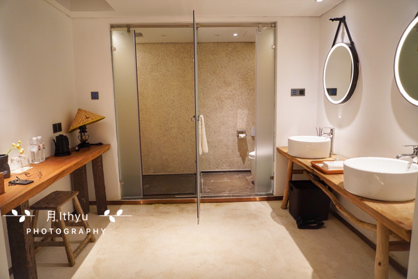 这次住的房间是大床房,木制的茶几、小凳子,木制的置衣架,在床头的则是闽南古厝画,还有着懒人沙发和小沙发凳子。独立的洗浴间及卫生间,最爱的就是有两个洗脸池,这样就不用排队洗脸了呢。