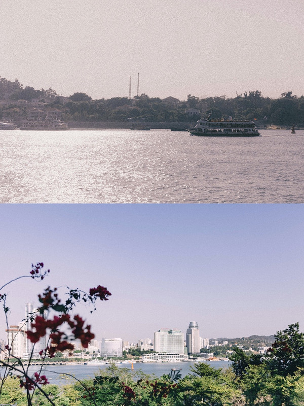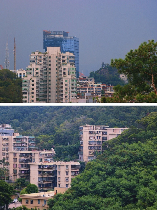 先打车上山,目的地定位在“海上明珠观光塔”,也就是从狐尾山往下走到邮轮码头,再从螺旋楼梯下来