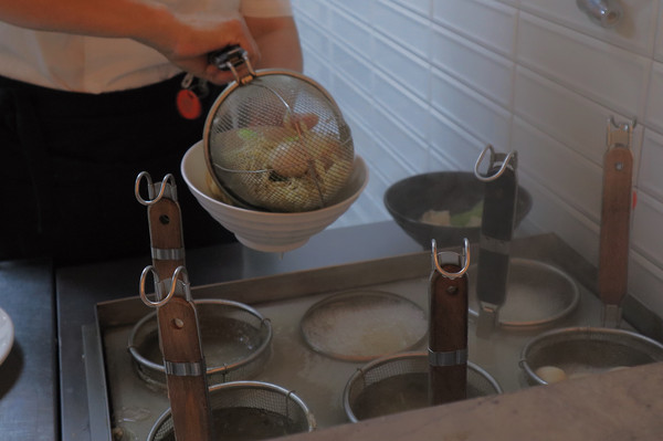 沙茶面的妙在于汤头,面条放入笊篱下锅烫熟,捞到碗里