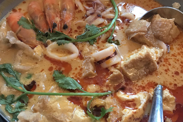 随口味加入鸭腱、鲜鱿鱼、豆腐干等辅料,最后淋上大锅里滚开的汤料,适口者珍