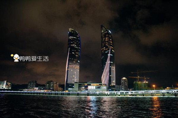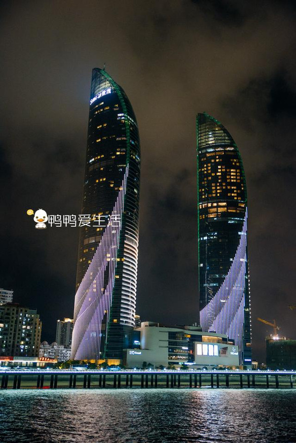 世界上离海平面最近的大桥——演武大桥,在海中的角度可以切实看到桥面离海平面确实很近,桥身在灯光的映衬下犹如银丝玉带缠绕在双子塔旁。厦门最高的地标建筑——世茂海峡双子塔,在夜色下犹如两柄尖刀直刺夜空。