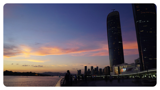 已是黄昏时刻,双子塔和演武大桥的灯光也已点亮