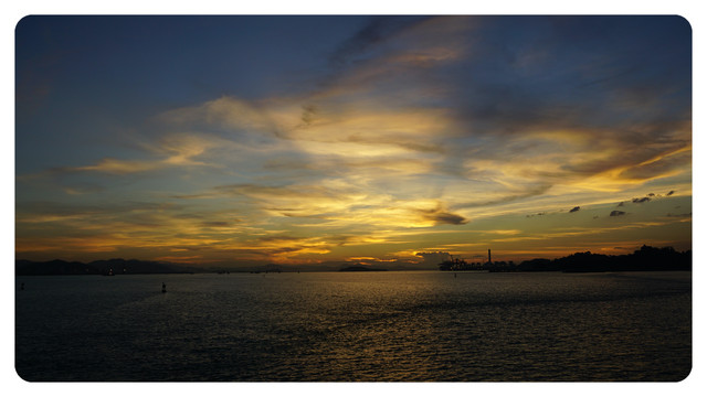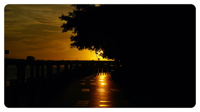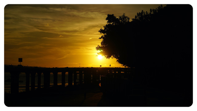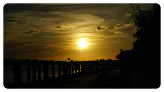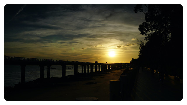 换一个角度,夕阳下的演武大桥,透过桥间缝隙的红色夕阳是点睛之笔