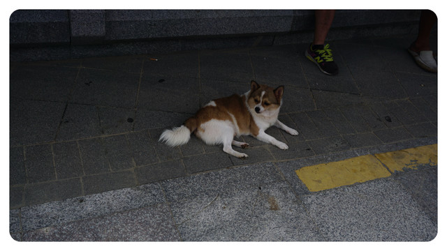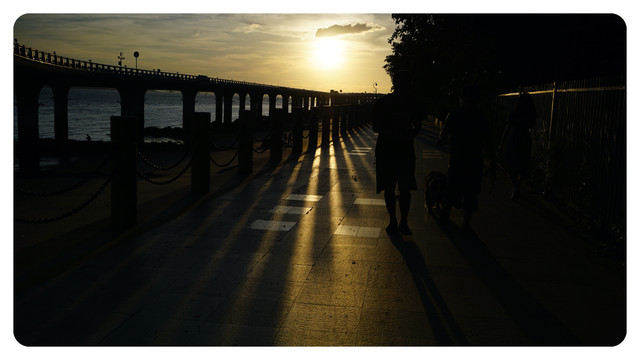 海滨栈道上,路边的狗狗也沉浸在美丽的夕阳下