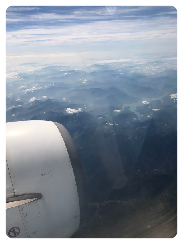 飞机起飞之后,很快便穿过了云层,阳光也照进了机舱内。其中的这一段风景,山脉隐隐约约,层层叠叠,如同水墨画一般。