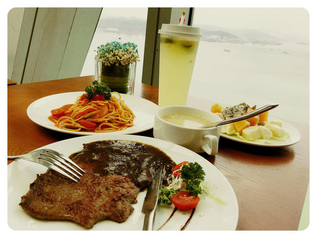 在一个靠窗的座位上慢慢坐下。色拉,意面,牛排,好好享受这一顿期待已久的午餐~