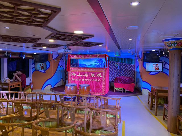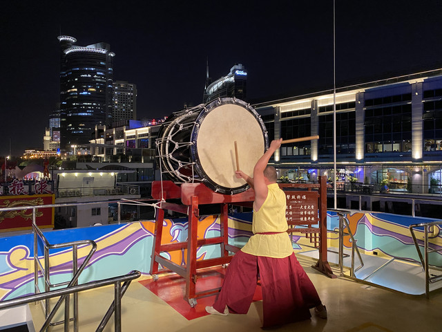 第二层是吃点心和茶点看海的餐厅,第三层是观光层,视野更好!准备开船时,来到船尾参加环鼓夜游的启航仪式,随着隆隆鼓声,震撼有力,船缓缓驶出港口,开启了环鼓夜游的路程!