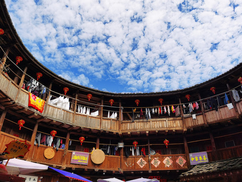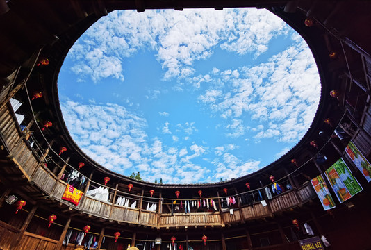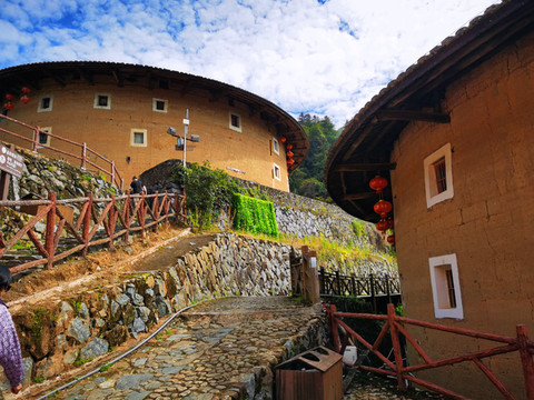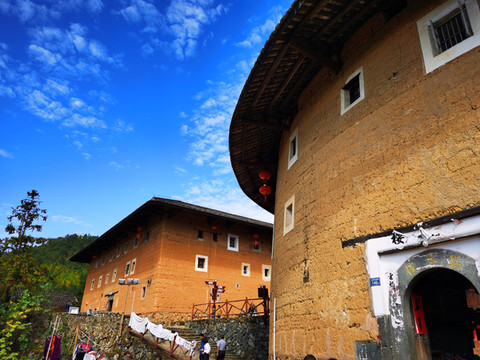 斑驳的黄土楼必须在蓝天白云的映衬下才会显得格外醒目,气势恢宏!