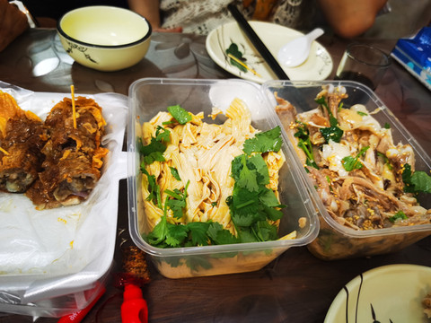 这是我排队买来的八市网红,炸五香,就是油炸版素火腿;手撕鸡和腐竹,拿到手才发现袋子上写着“上海特色”,我晕。。。。。。。。。