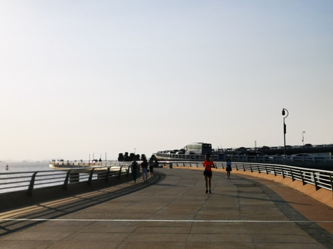 迎着朝阳,从演武大桥出发,沙滩上有当地人聚集在晨归的渔船周围买新鲜的海货;有三三两两的散步游客、有环卫工人清扫着飘零的树叶,没有吵闹喧嚣,一切都是那么有条不紊,安静从容。美好的一天从晨练开始。。。。。。