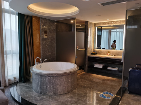 霞浦不大,住宿宾馆位置离霞浦火车站、闹市区都不远。房间之大超出我们的想象,头一次睡了圆床,硕大的浴缸奢侈的摆放在房间中间。可惜啊可惜,我被过敏症状折磨的也没泡浴缸,也没好好感受睡圆床的感觉,欲哭无泪。。。。。