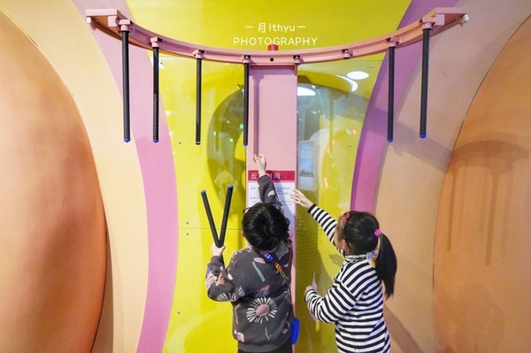 和谐馆的反应时间,是非常考验反应能力的一件互动展项,挂好的杆子,随机掉下来,要准确的全部抓到不容易。闺蜜玩了下,很受伤……一根也没抓到,我在旁边笑的肚子痛。还是小朋友厉害,抓到好几根。