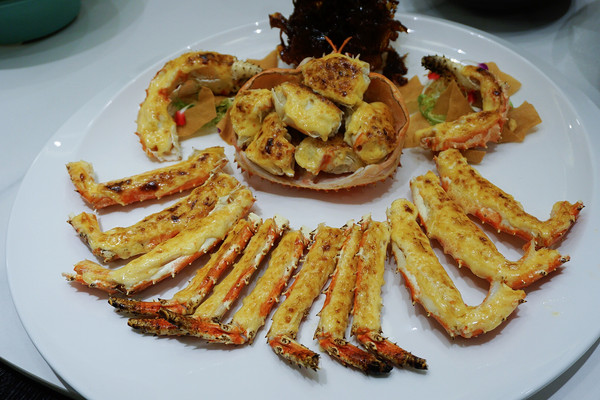 法式海胆酱帝王蟹:帝王蟹大约四斤左右,足够8人分食,量是诚意满满的,帝王蟹搭配海胆酱还是第一次吃。满盘的黄灿灿透着浓郁的香气,帝王蟹用海胆酱焗,肉质的汁水保存完好,肉质鲜滑。吃起来一点也不腻,适合现在这样的季节。