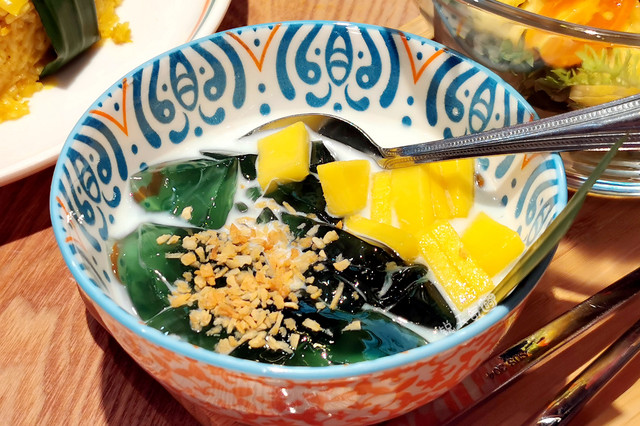 墨绿色的香兰冻,香气特别,Q弹滑爽,配着浓浓的椰奶,香甜的芒果,真是惊艳到了!
