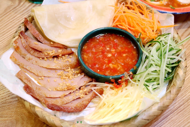 春卷皮包裹着不柴不腻的炭烧猪颈肉,搭配着胡萝卜丝、黄瓜丝等,酸甜的酱汁是点睛之笔,自己动手卷着吃,感觉更美味了呢。