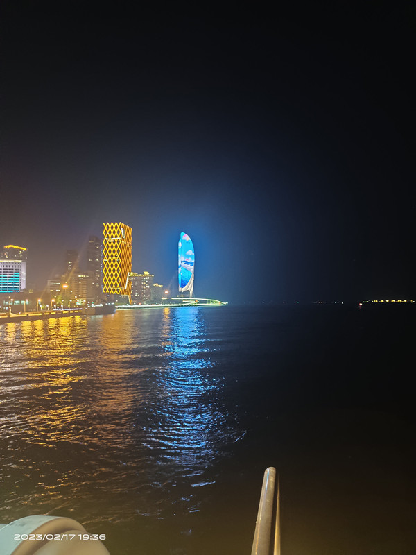 环鼓夜游是在中山路码头,坐船围绕着鼓浪屿行驶一圈后回到中山路码头,90分钟左右,票价不到150元,开始人们都跑到船的顶上看风景,途中还有一些灯光秀,投射在海面上一些海中生物。但由于晚上的海上风大又冷,40分钟后船顶部基本没什么人了,全都跑到二层的船舱里看电影了!
