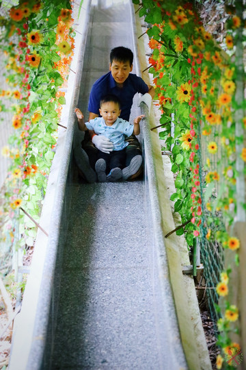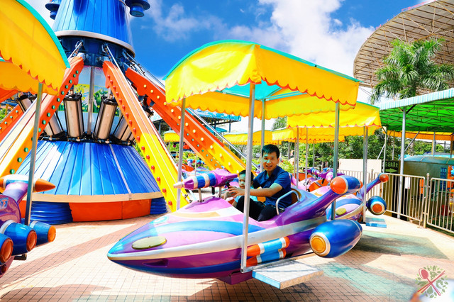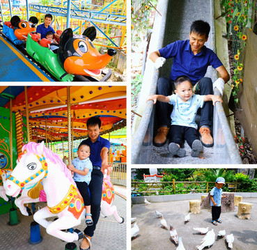 游乐场有很多亲子游乐设施,我们本来想让宝宝玩旋转木马,没想到他喜欢刺激的高空项目,硬是让爸爸陪他玩自控飞机、丛林飞鼠……把有恐高症的爸爸吓个半死!