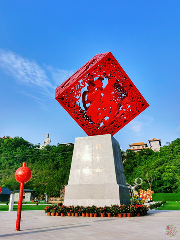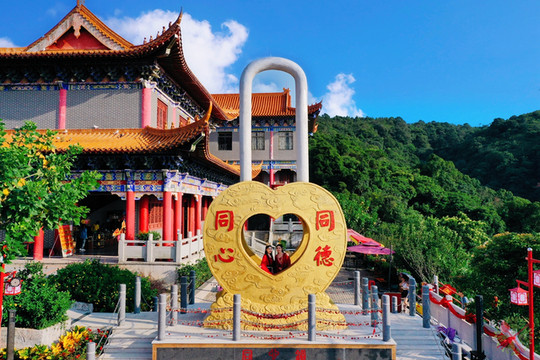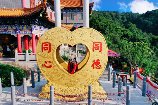 观音广场吉祥苑的同心锁有9米高,金色锁面在阳光下灼灼生辉,心形镂空窗是最佳拍照点,双胞胎姐妹也在这里自拍。很多情侣来此扣下同心锁,希望爱情能长长久久,幸福美满。