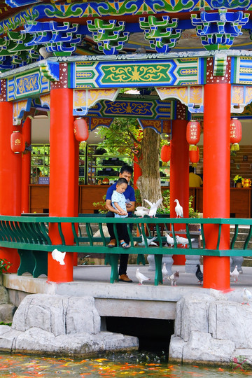 我们在许愿池旁喂喂鱼鸽子,本想给宝宝拍鸽子飞起来的美照,结果他一直忙于数玉米粒,无视想来啄食的鸽子。我们还让他撒鱼食喂锦鲤,结果他顾着看锦鲤连饭都不想吃了,无语!