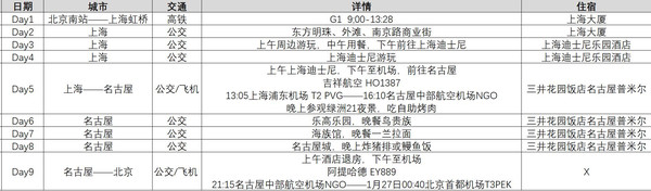 另附【全程行程安排明细表】:北京-上海-名古屋-北京