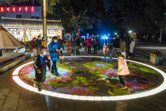 这个喷水装置好神奇,外围一圈的灯光踩上去会感应变色。