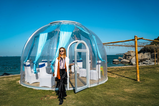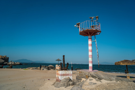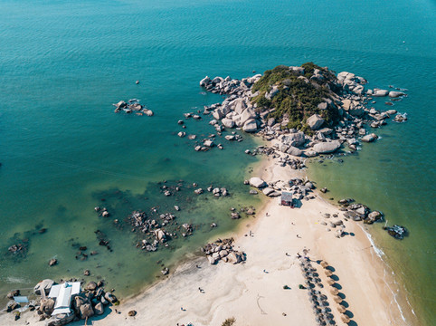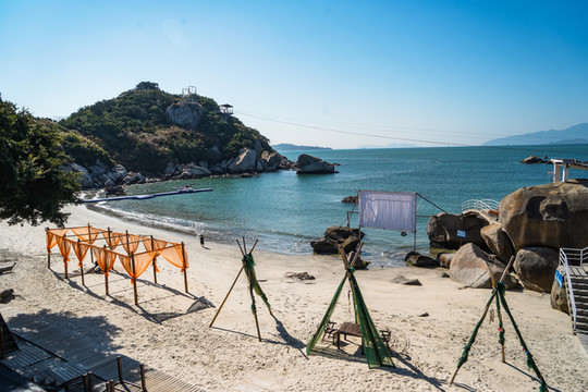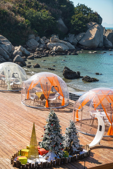 岛上还有一家民宿,就在沙滩边上。全部都是面海沙屋,出门便是沙滩。大部分房间都配有户外的面海大浴缸,亲子、情侣均可浸泡在浴缸里面朝大海,春暖花开,还有独立的透明包间,冬天在这里就餐,既可以欣赏海景,也不会觉得寒冷。听工作人员说,这家民宿还配有专业西厨,为住客提供浪漫温情的沙滩晚宴。除了浪漫的沙滩晚宴,我还发现他们在沙滩上还挂了布幕,可以在沙滩上观看电影。